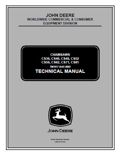 This is the Highly Detailed factory service repair manual for the JOHN DEERE CHAINSAWS CS56, this Service Manual has detailed illustrations as well as step by step instructions,It is 100 percents complete and intact. they are specifically written for the do-it-yourself-er as well as the experienced mechanic.JOHN DEERE CHAINSAWS CS56 Service Repair Workshop Manual provides step-by-step instructions based on the complete dis-assembly of the machine. It is this level of detail, along with hundreds of photos and illustrations, that guide the reader through each service and repair procedure. Complete download comes in pdf format which can work under all PC based windows operating system and Mac also, All pages are printable. Using this repair manual is an inexpensive way to keep your vehicle working properly.