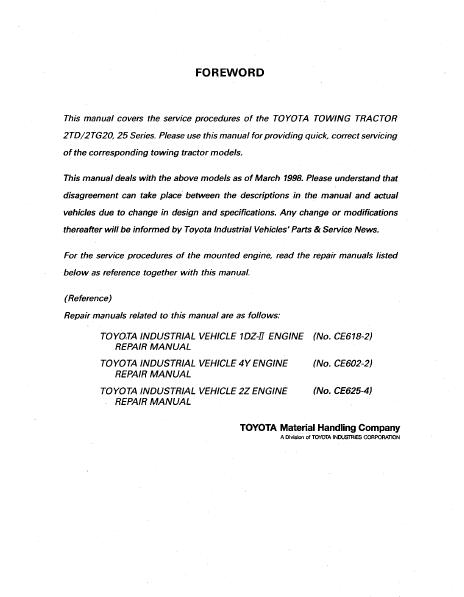 NO waiting, Buy from responsible seller and get INSTANT DOWNLOAD, Without wasting your hard-owned money on uncertainty or surprise! All pages are is great to haveTOYOTA 2TG25 TOWING TRACTOR Service Repair Workshop Manual.